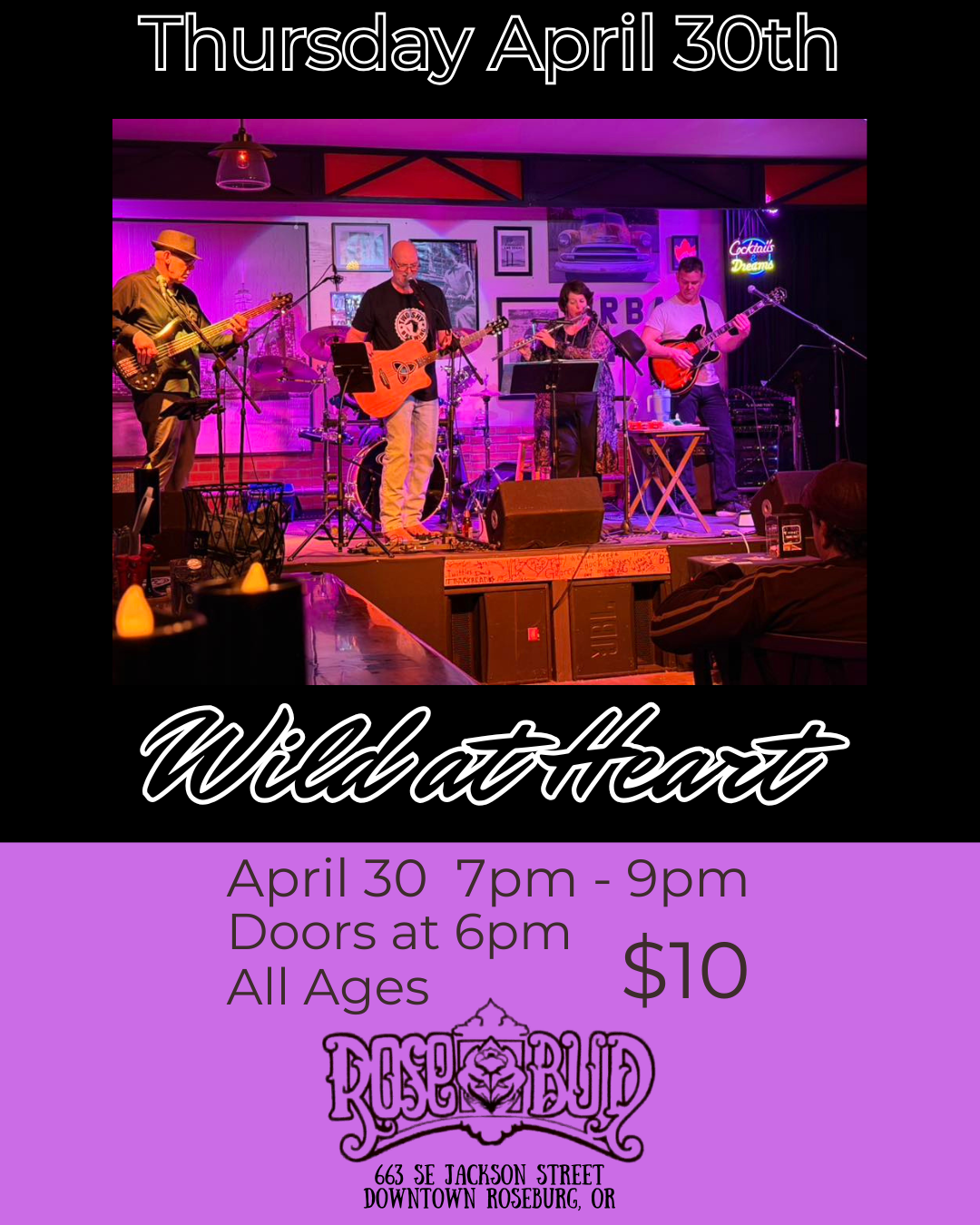 Wild at Heart Band, LIVE and Local at The Rosebud // $10 // All Ages // Doors 6pm, Show 7pm // Rock ‘n’ Roll, Classic Rock