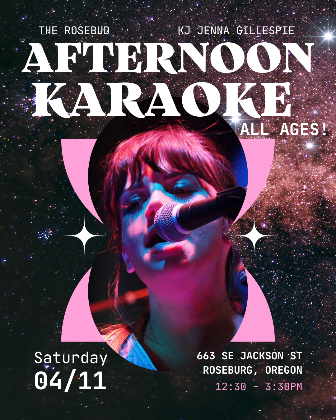 Join your favorite KJ Jenna Gillespie for an afternoon of Karaoke at The Rosebud! Come downtown, enjoy the Umpqua Valley Farmers Market, then make your way to The Rosebud to take the stage!