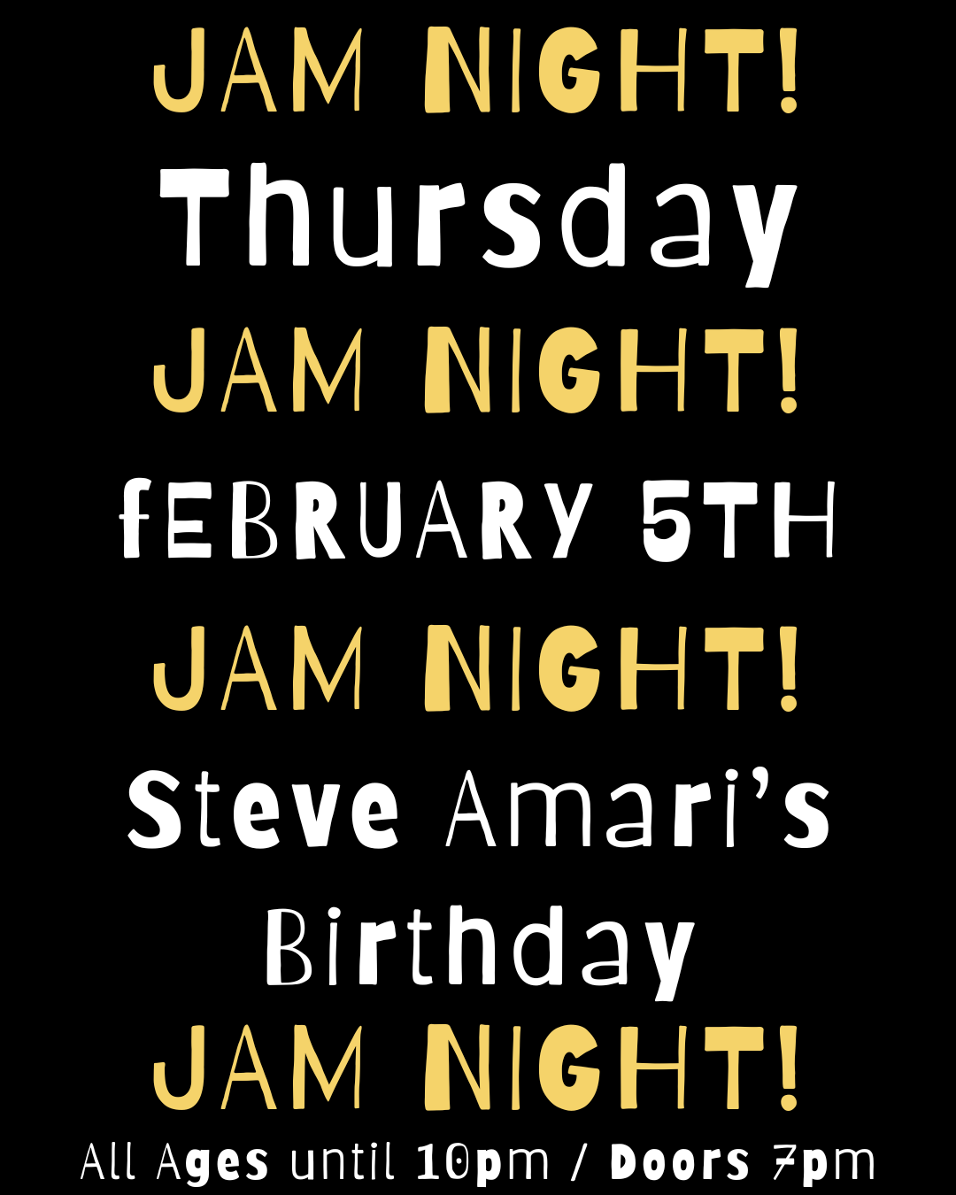 It’s Jam Night at The Rosebud! Come celebrate bassist, sound engineer, and Thursday Jam Night founder Steve Amari’s birthday with a night of libations and free improvisation! All ages until 10pm, drums and amps provided, and of course.. NO COVERS!