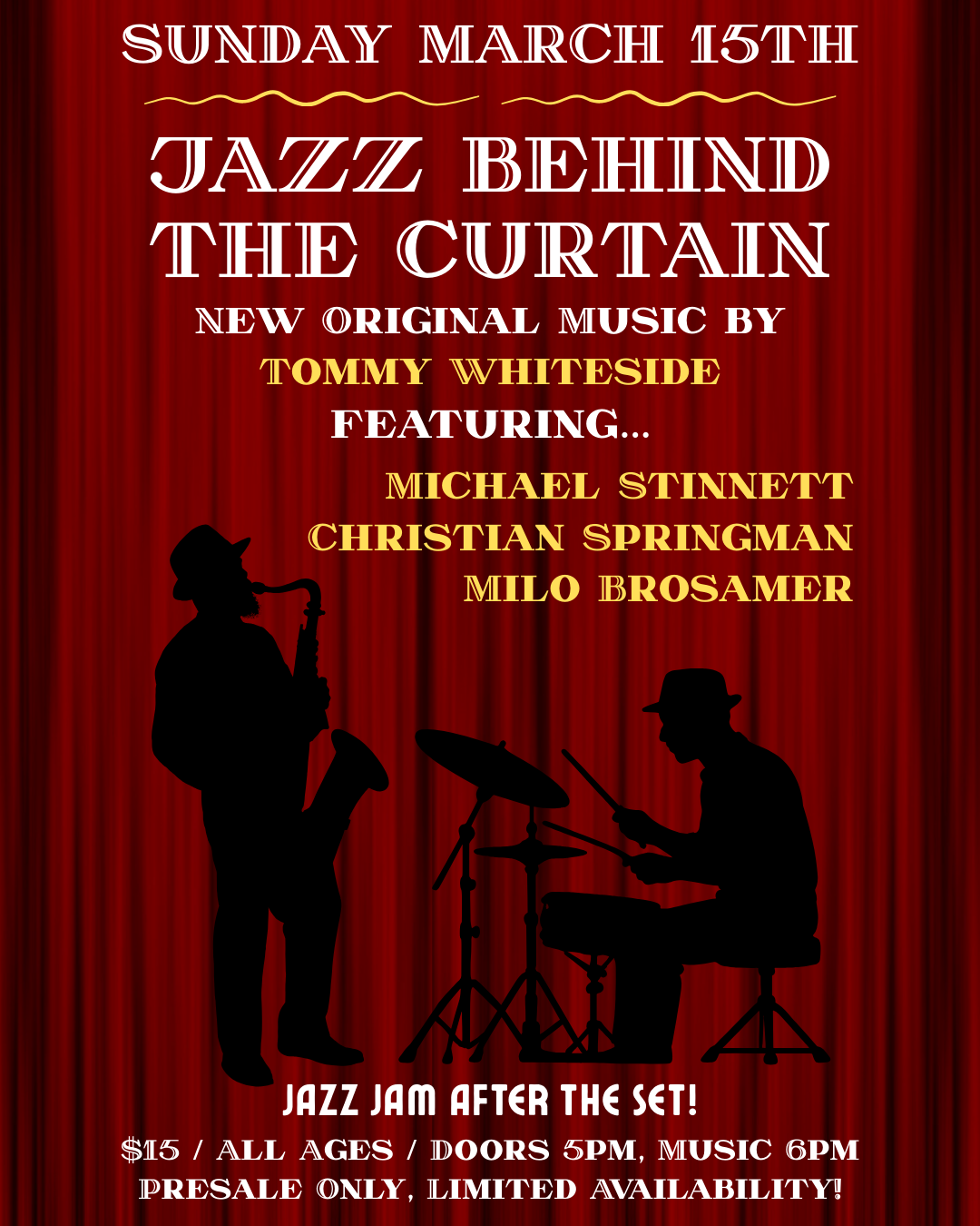 At the Rabbit Hole! Jazz Behind the Curtain: Tommy Whiteside Quartet LIVE and OFFSTAGE // $15, Presale ONLY, LIMITED AVAILABILITY // All Ages // Doors 5pm, Music 6pm // Jazz, Experimental, Instrumental